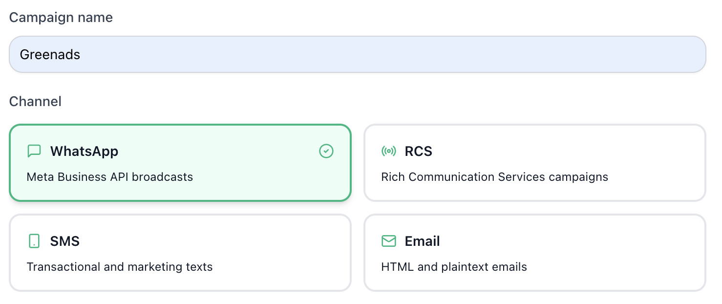 Choose WhatsApp, RCS, SMS, or Email — or run multi-channel campaigns simultaneously.